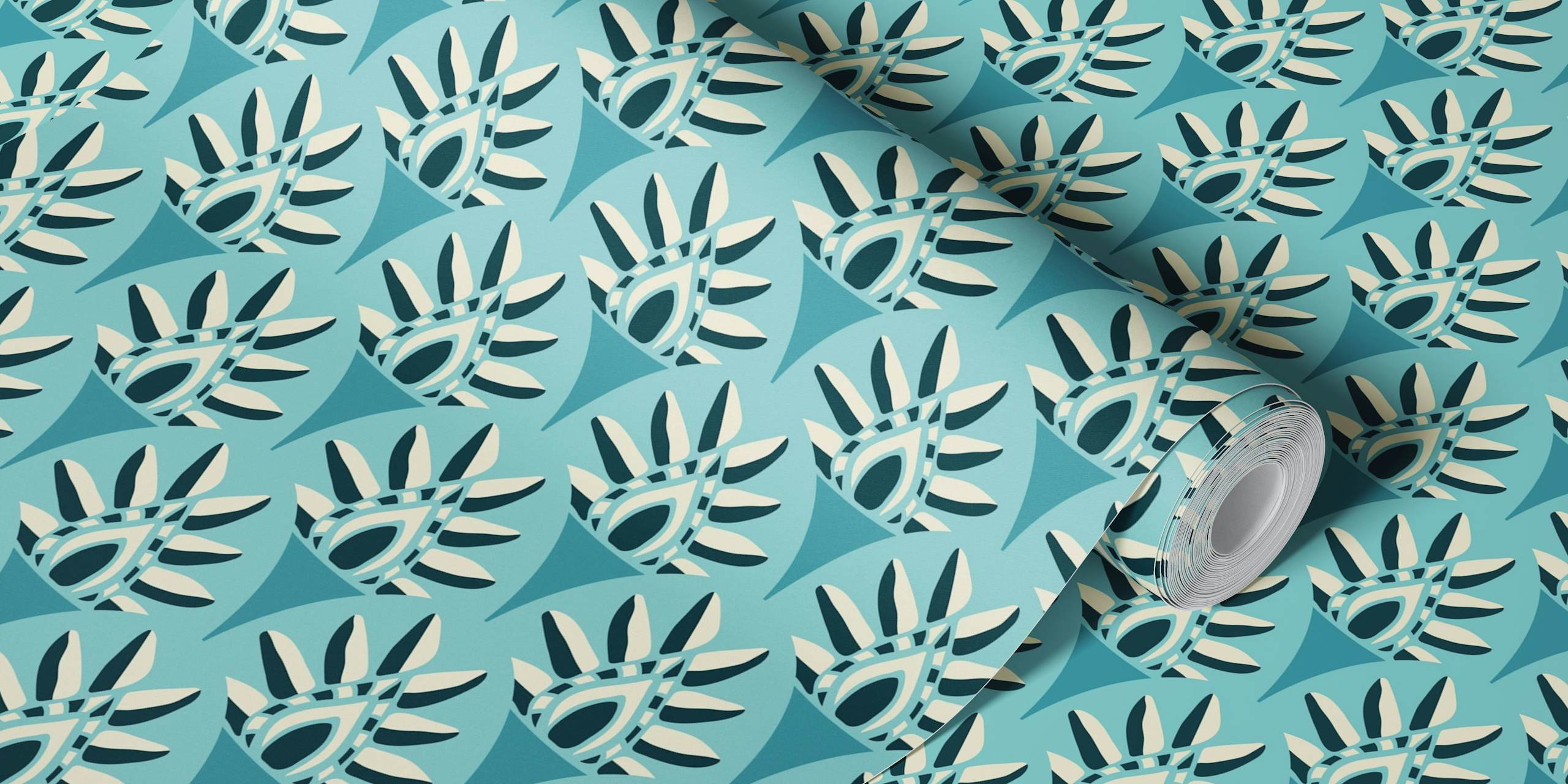 Neo-Classical Mediterranean Greek stylized abstract botanical leaves in scallop shapes in Greco-Roman Colours: Aqua, Deep Blue and Warm White on Teal! A bit cottage romantic too! This pattern design is also available in Other Colourways too. Original wallpaper pattern design by Jackie Tahara of UnBlink Studio.
