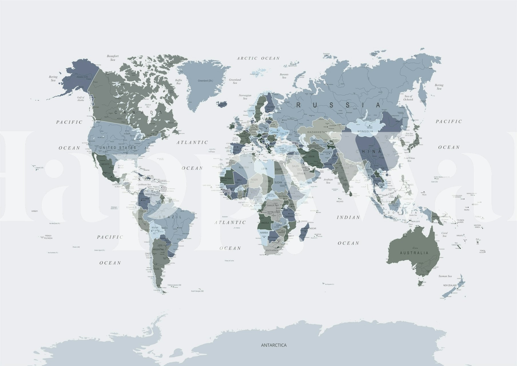 World Map Blue Green wallpaper is made of non-woven material. Each panel is 50 cm wide / 19,7 inches wide