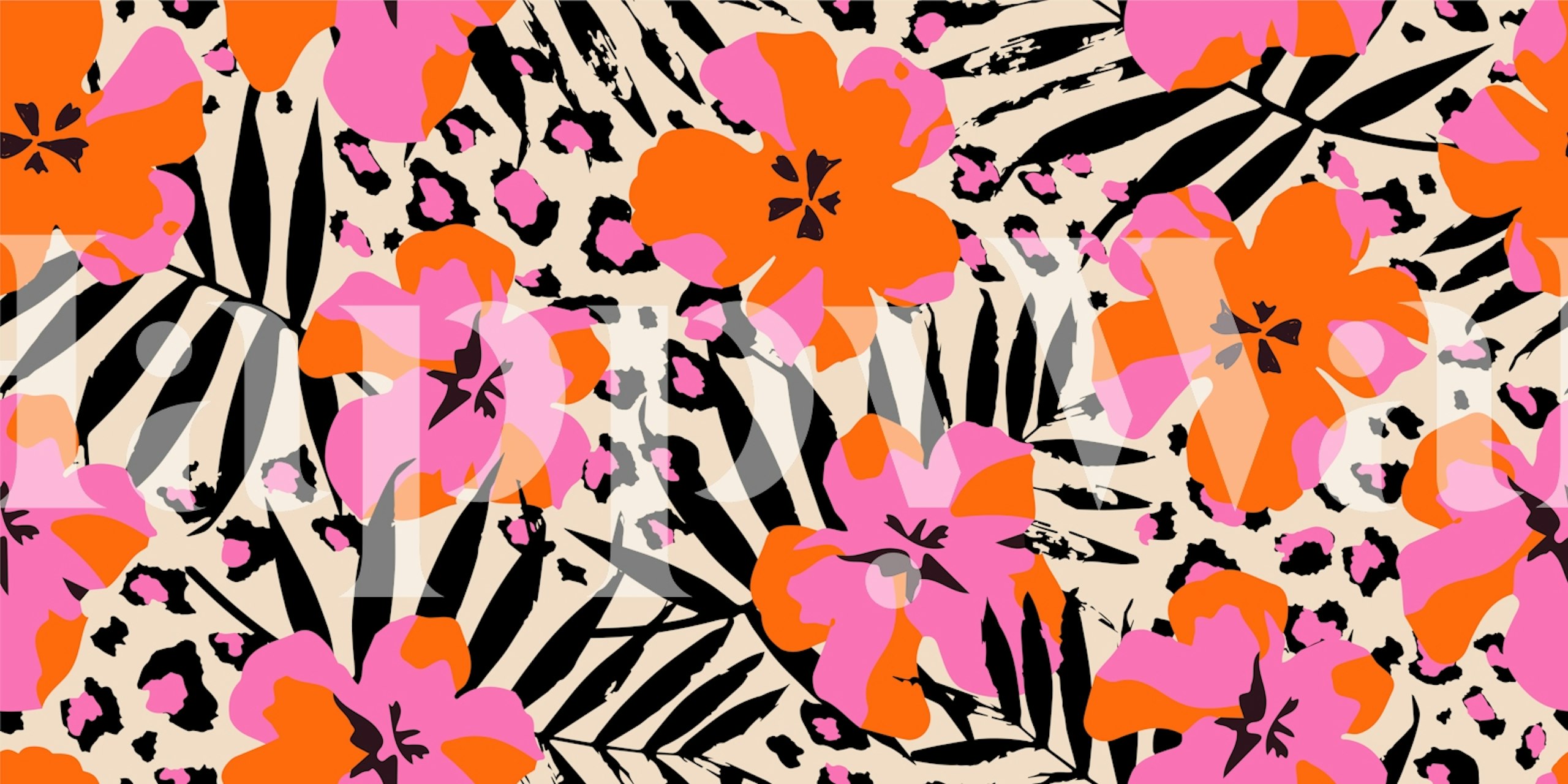 Denne fantastiske tapet har et dynamisk miks af tropiske blomster og leopardmønstre, perfekt til at tilføre et livligt strejf til ethvert rum. Det farverige og eksotiske design inviterer til en livlig atmosfære og forvandler dit rum til et tropisk paradis. Ideel for dem, der ønsker at forbedre deres indretning med et strejf af dristig og kreativ flair. Udforsk skønheden ved floral kunst med denne unikke tapet, der fanger opmærksomhed og inspirerer til kreativitet.