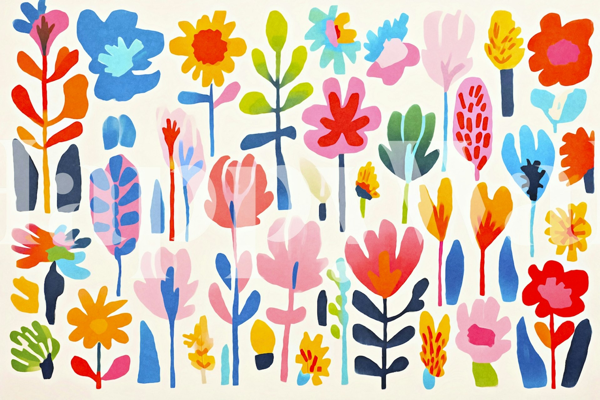 Farverige blomster og blade i et groft penselstrøg Henri Matisse stil og med let akvarel tekstur. Dette moderne design giver et pudsigt præg og legende æstetik til ethvert rum med sine flerfarvede botaniske mønstre. Designets lette tekstur og de dristige, livlige komplementære farver introducerer en unik dybde, der henter inspiration fra sommerudendørsscenerier, mens de bevarer et chik, sofistikeret look. De livlige bølger af farver og blomstrende blomster får designet til at skille sig ud uden at være for overvældende. Dette tapet er perfekt til dem, der ønsker at bringe skønheden i en evigt blomstrende have ind i deres hverdag, og det giver dig en drømmende flugt til en verden af magiske farver og natur, lige i dit eget hjem. En fancy stilfuld retro vægdekoration til et moderne hjem, men også sød til en vuggestue, børnehave eller blomsterbutik