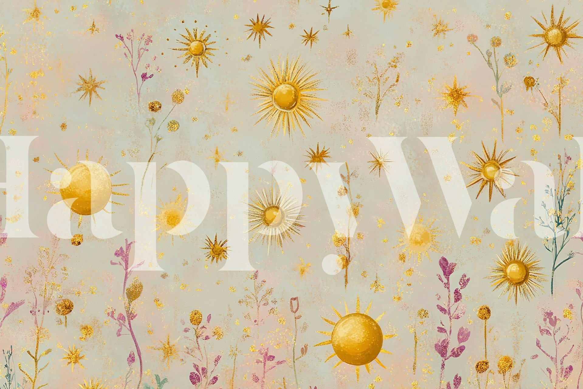 Transform your space with this enchanting decorative wallpaper, featuring a whimsical arrangement of delicate flowers, radiant suns, and tiny golden stars. The soft color palette creates a serene backdrop, perfect for adding a touch of warmth and cheer to any room. The intricate floral details entwine gracefully with the cheerful suns, while the shimmering stars introduce a subtle hint of elegance. Ideal for crafting a cozy, inviting atmosphere, this wallpaper is perfect for both contemporary and classic interiors.