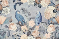 Exotic parrots in lush vegetation with flowers and leaves in delicate pastel shades, perfect wall decoration in trendy urban jungle style