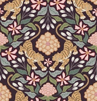 Floral with tigers in a symmetrical layout. Orange, pink and green on a dark brown background. The dark background creates a more moody atmosphere.
