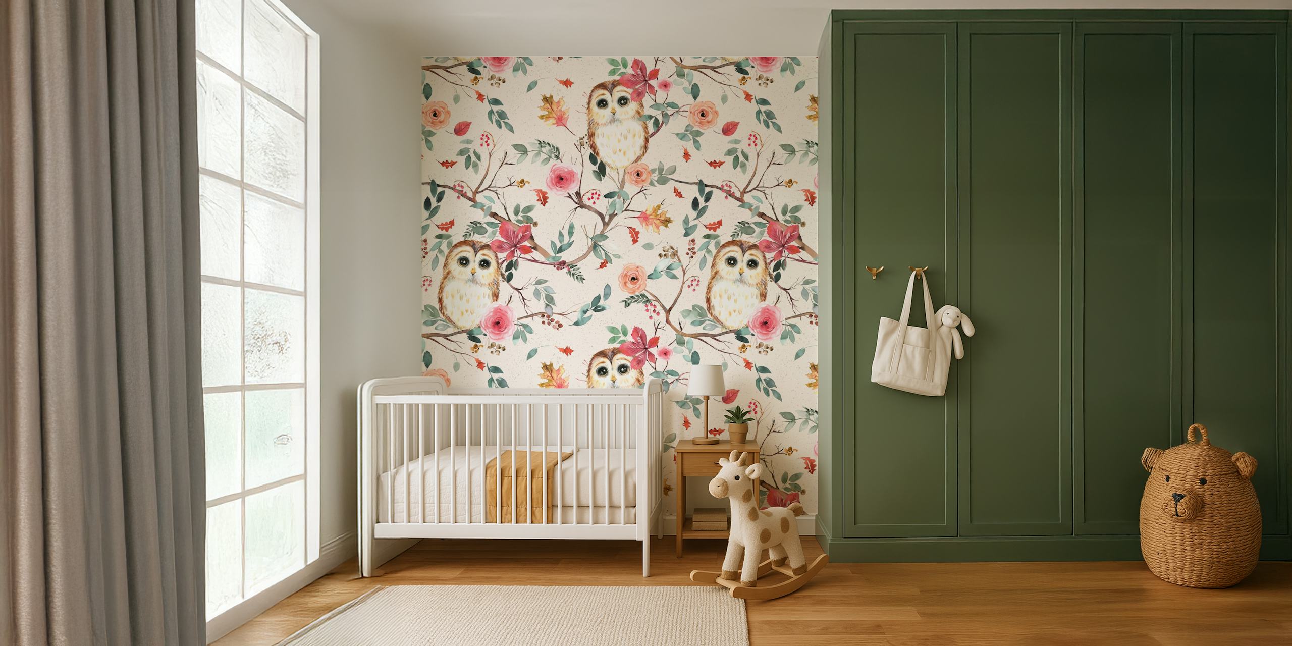 Transform your interior with this charming design featuring adorable owls nestled among elegant florals and leaves. Perfect for kids' rooms or nature-inspired spaces, this wallpaper brings a whimsical touch to any wall. Embrace the playful vibe and create an environment that sparks joy and creativity. Ideal for those looking to add a personal flair to their décor, this design is both eye-catching and versatile.