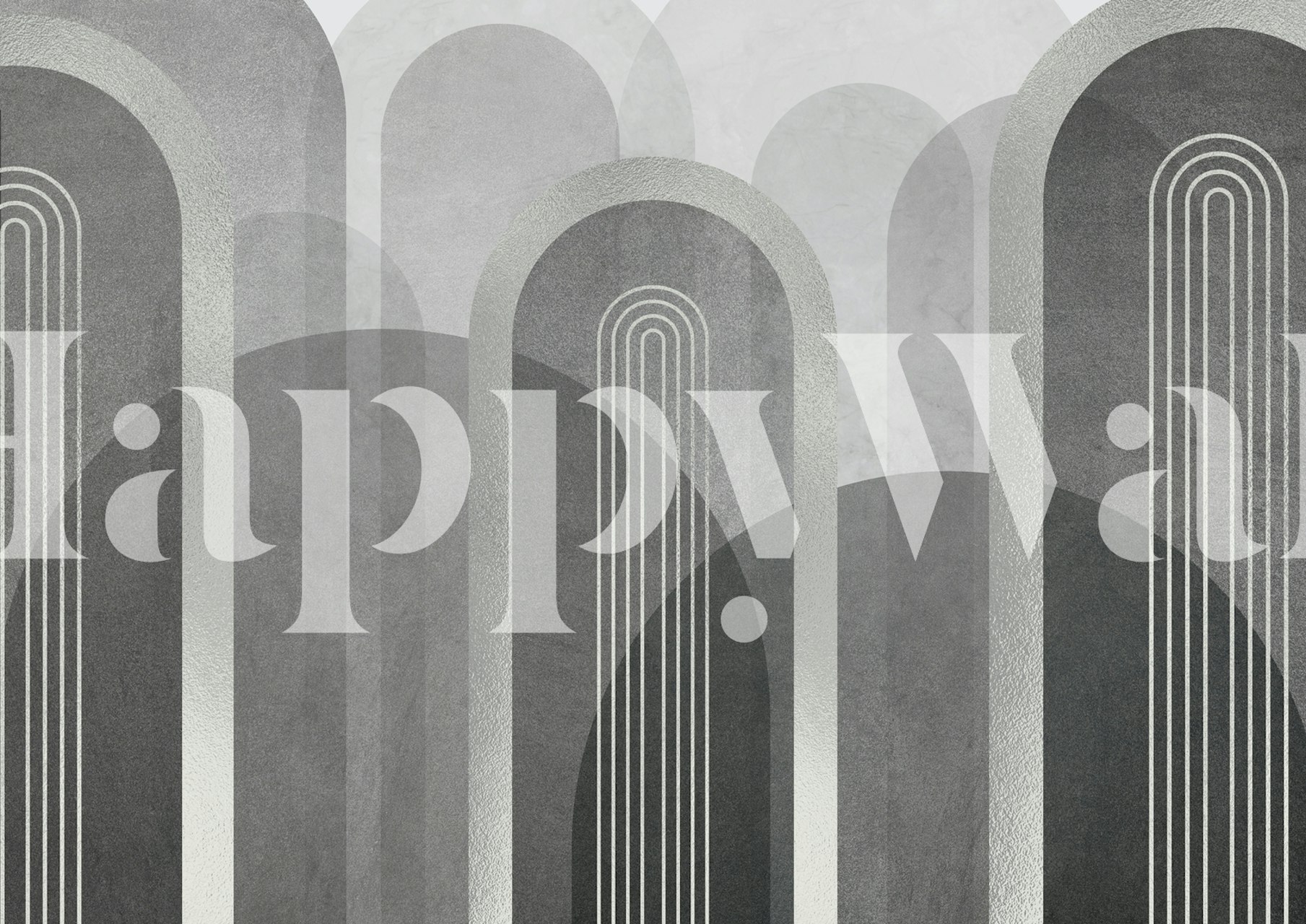 A stunning mid century inspired wall mural in soft grey with silver arches.