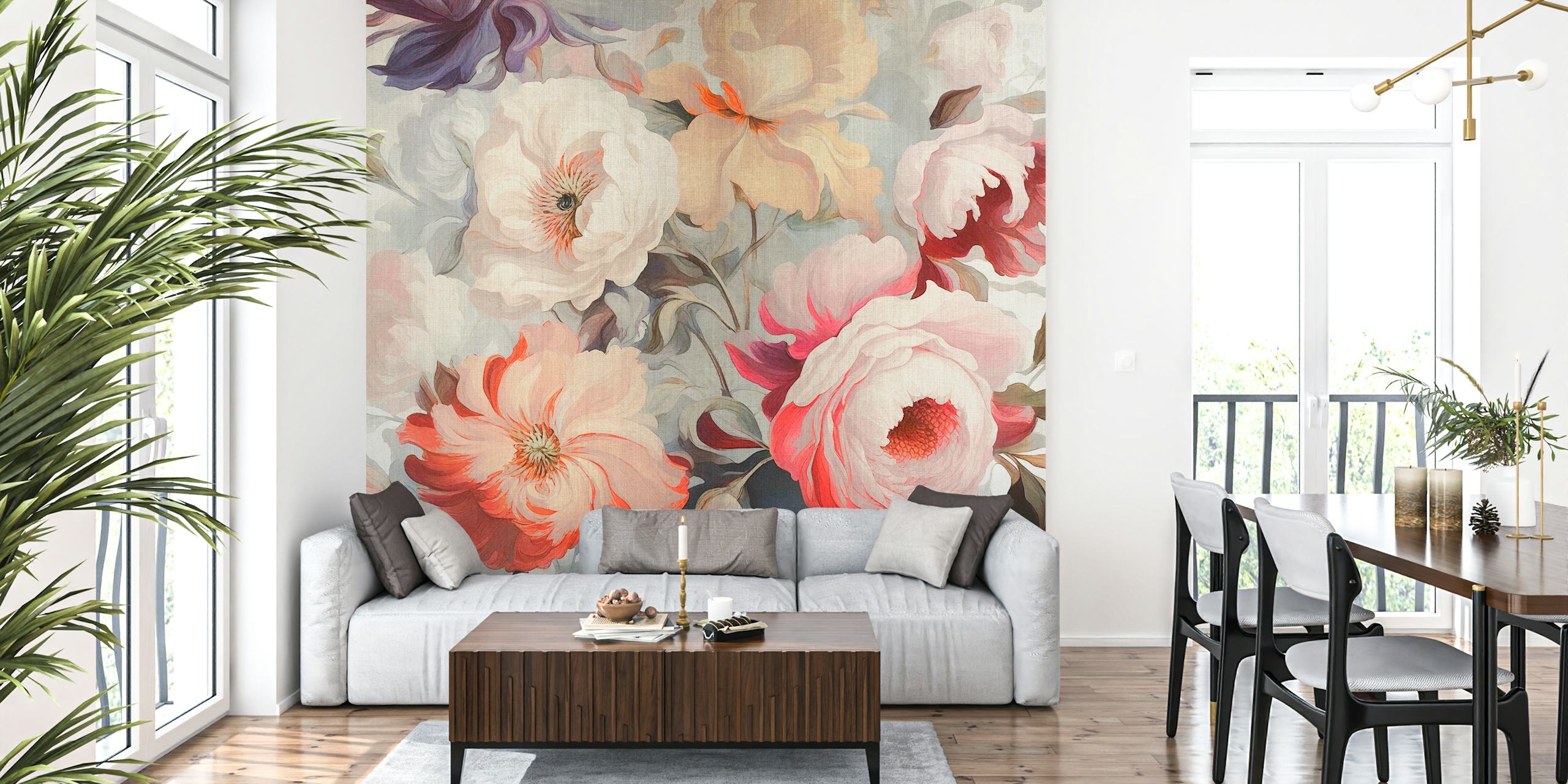 Introducing Large Baroque Flowers. Capture the moody sophistication of a fading era with this exceptional wallpaper. The large canvas design is brushed with muted hues and irresistible floral details, conjuring up a timeless sense of old-world charm. Create a lavish look with this expansive wallpaper, perfect for both modern and traditional interiors. Offering an air of indulgence, Large Baroque Flowers will bring a hint of vintage magnificence to your home.