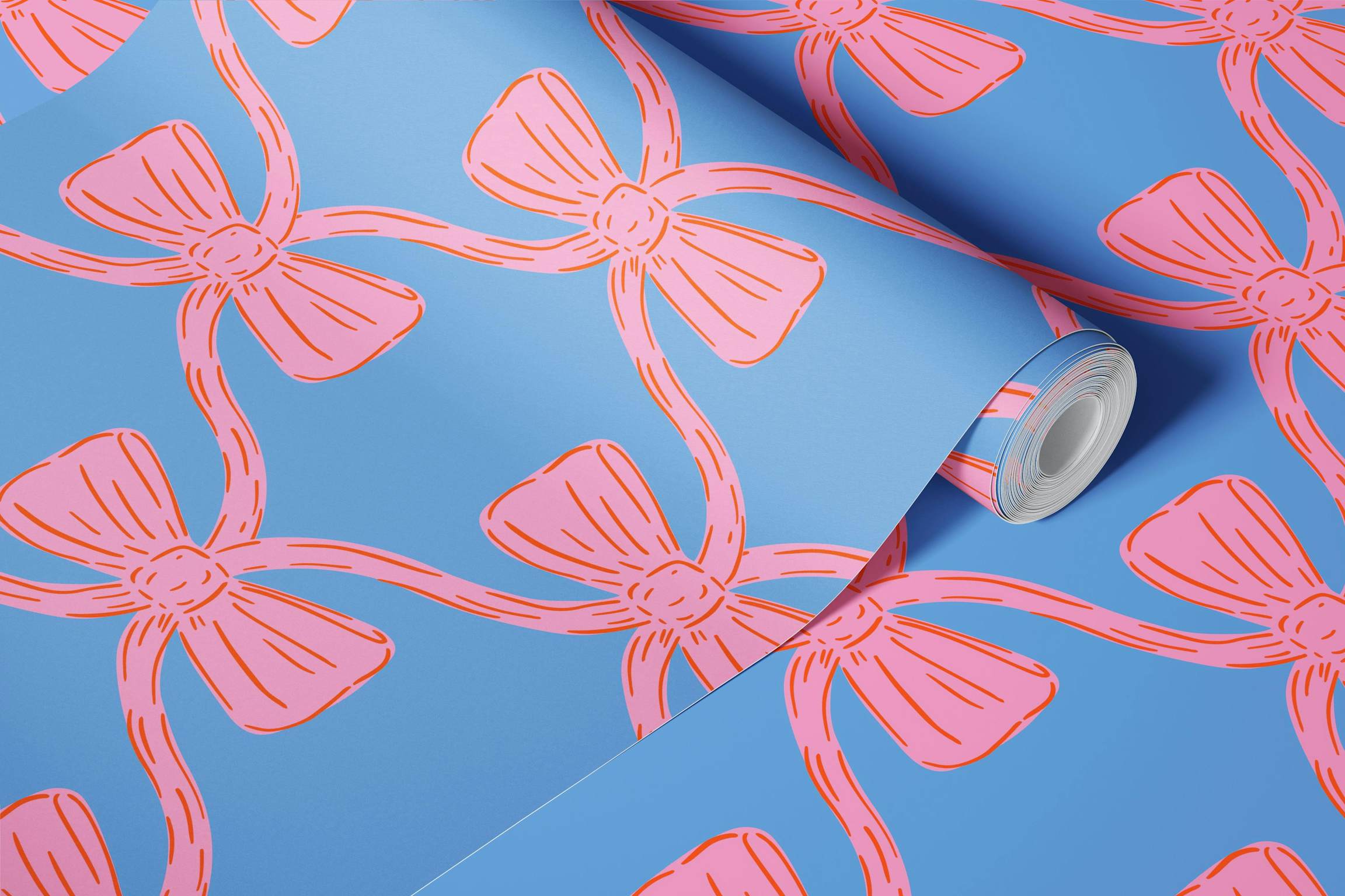 Bold ogee hand drawn pink bows on blue papel pintado se puede personalizar para su pared. Tú decides el tamaño exacto y cómo quieres recortarlo.