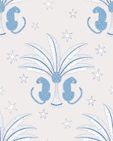 A peaceful pair of leopards under a palm tree on a starry night! Hand drawn leopards, palm and stars on a soft beige background. Perfect for baby or kids wallpaper.