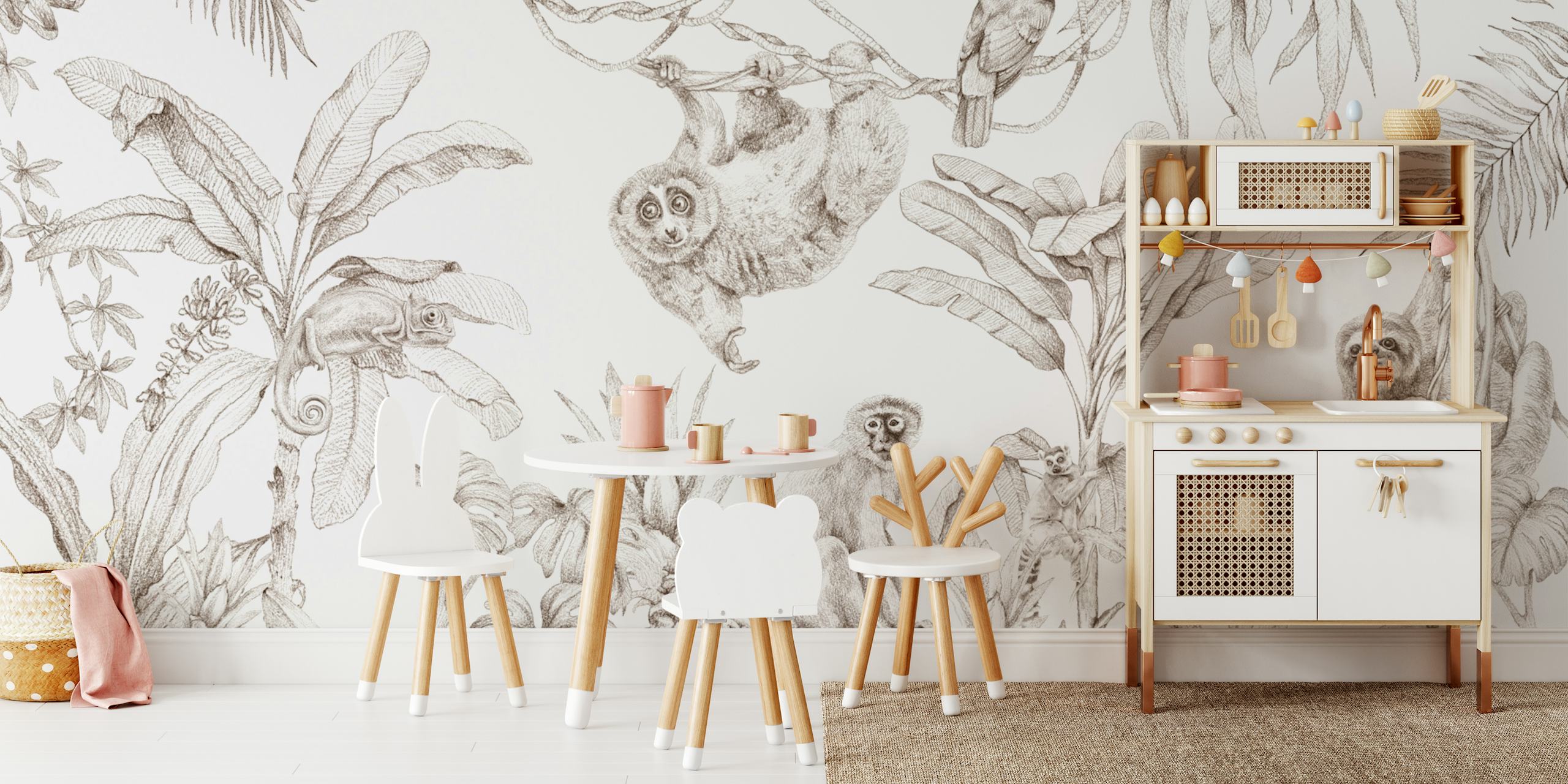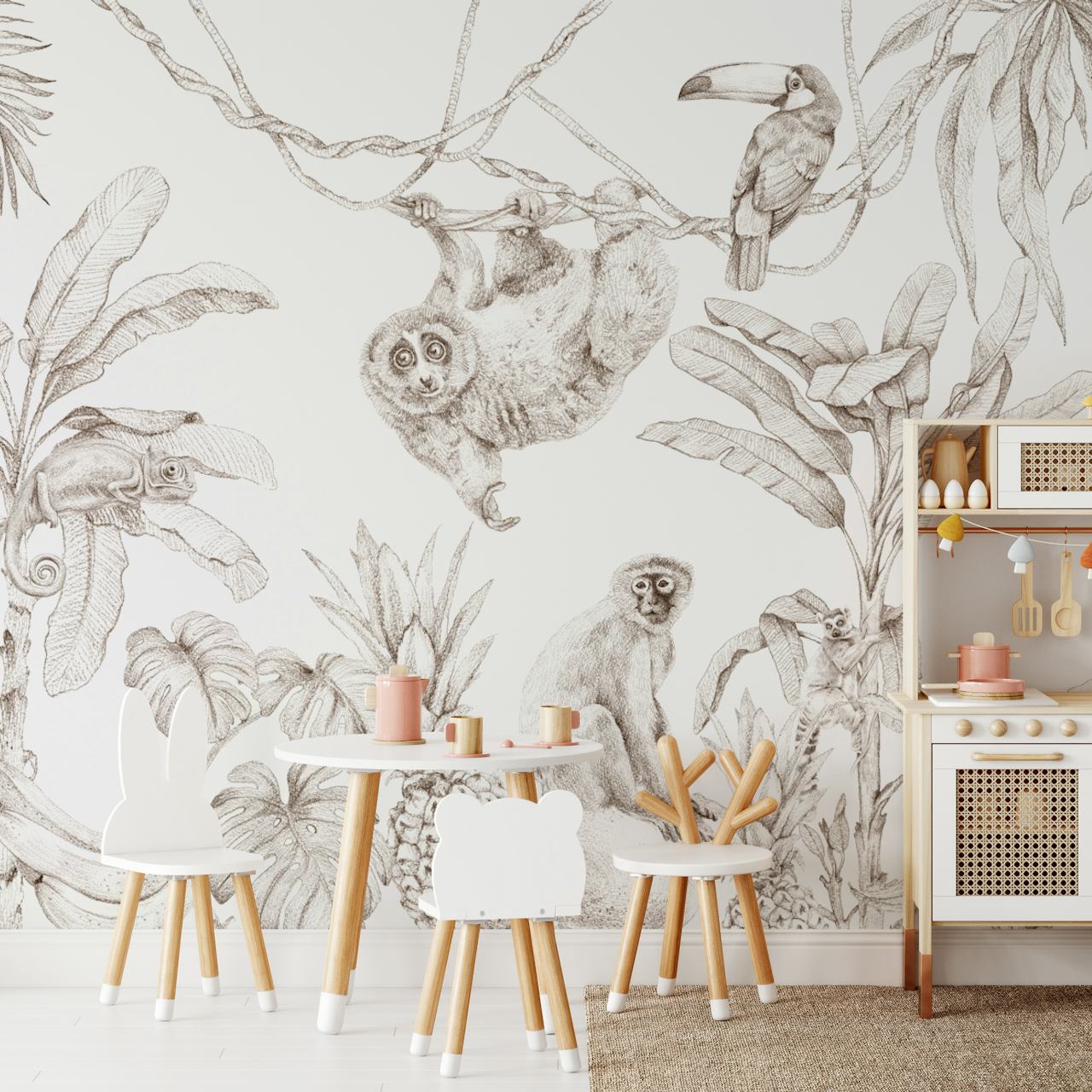 Predstavljamo savršeni mural za svaku dječju sobu - naš ručno oslikani akvarel safari životinje murala Ute Naumann! Neka mašta vašeg djeteta divlja s našim zapanjujućim i šarenim dizajnom koji prikazuje safari životinje poput majmuna i lenjivaca, okružen bujnim pejzažem džungle palmi, lišća i banana na svijetloj bijeloj pozadini. Topli i razigrani tonovi ove ručno oslikane akvarel murala sigurno će stvoriti zabavnu i avanturističku atmosferu u svakoj prostoriji. Savršeno za poticanje kreativnosti vašeg djeteta i inspiriranje ga da istražuje svijet oko sebe! Ne propustite priliku da donesete ovo živopisno i šarmantno umjetničko djelo u život vašeg djeteta. Kupite naš ručno oslikani akvarel safari životinjski mural sada i neka avantura počne!