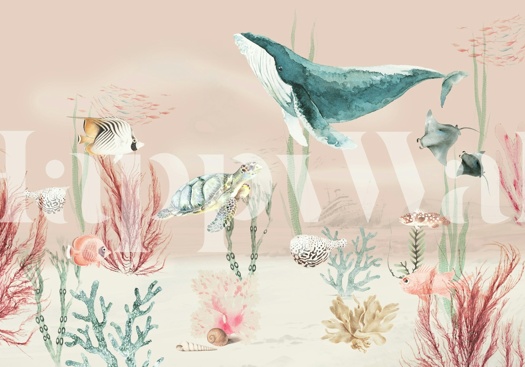 Tuffati in un mondo di tranquillità con questo affascinante design di carta da parati che presenta dolci creature marine in tenui tonalità di rosa e blu. Perfetto per creare un'atmosfera serena in qualsiasi stanza, questo design incantevole porta la bellezza dell'oceano all'interno. Trasforma le tue pareti con una vibrante vita marina, invitando alla calma e allo stile nella tua casa. Ideale per le camere dei bambini o qualsiasi spazio in cerca di un tocco di fantasia, questo design ispirerà creatività e gioia.