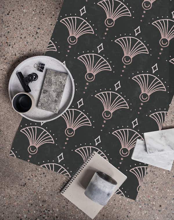 Art Deco style pattern with elegant rose gold ornaments on dark grey marble, for all who love the roaring twenties Gatsby style and vintage elegance of the 1920's and 1930's