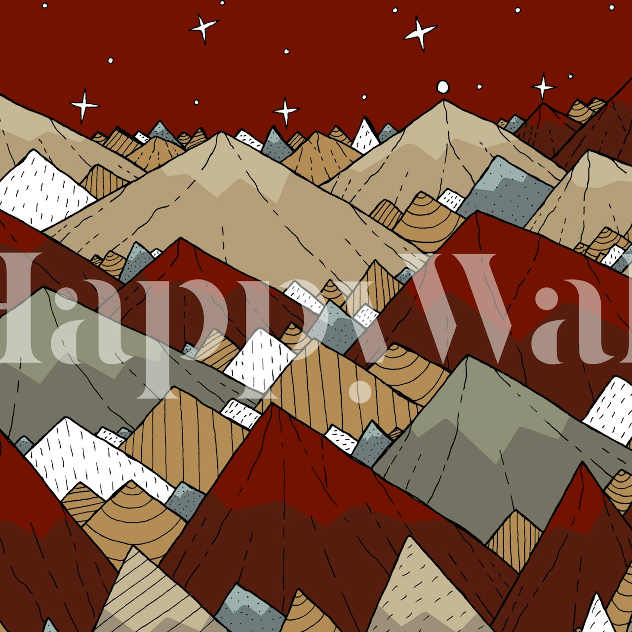 Transform your space into a mesmerizing landscape with the Dark red peaks wallpaper design. This striking pattern, featuring rich reds and earthy tones, draws the eye upward, creating a sense of height and drama. Ideal for adding depth and warmth to any room, the design's starry backdrop offers a tranquil night sky effect, perfect for relaxation or contemplation. A seamless choice for bringing a touch of the great outdoors inside without overwhelming your decor theme.