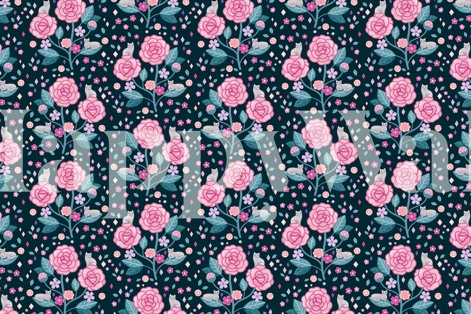 Camellia Cats tapet fototapet tillverkas av non-woven. Våderna monteras kant i kant. Vådernas bredd är 50cm.