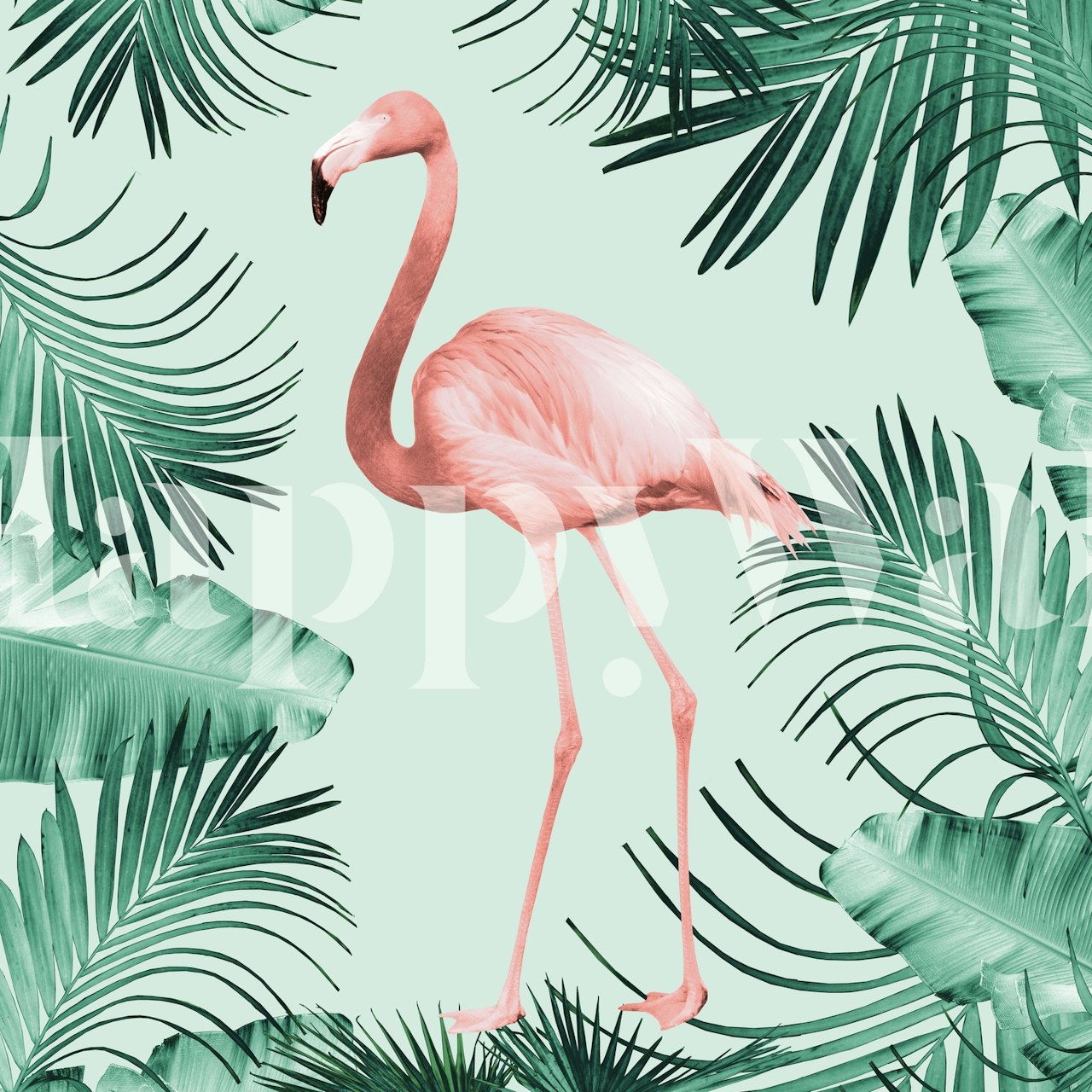 Flamingo in the Jungle 1 tapet fototapet tillverkas av non-woven. Våderna monteras kant i kant. Vådernas bredd är 50cm.
