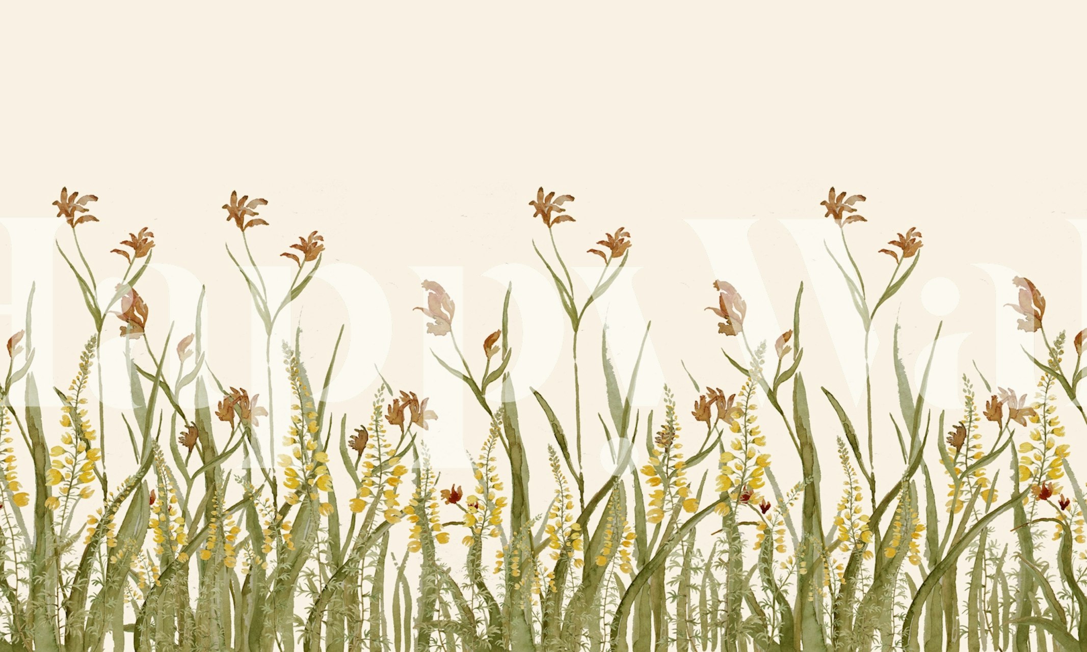 Flower meadow a botanical watercolor mural tapet fototapet tillverkas av non-woven. Våderna monteras kant i kant. Vådernas bredd är 50cm.